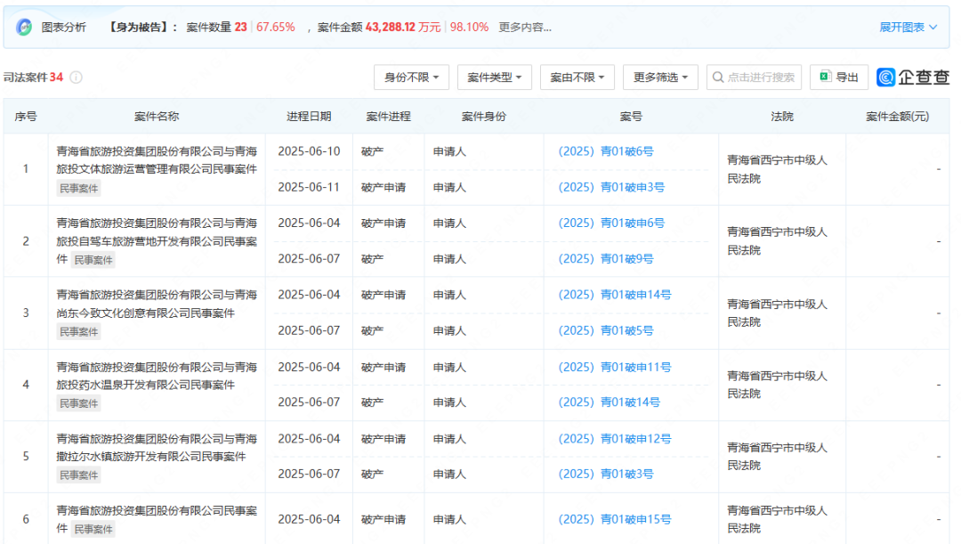 畢竟今年6月這份《法院公告》,不只是青海省旅遊投資集團股份有限公司破產,它還把下面的十幾家子公司全帶走了:路遊網、撒拉爾水鎮、尚東今致、文體旅運營、自駕營地、融資擔保、藥水温泉、鐵航國際旅行社……
