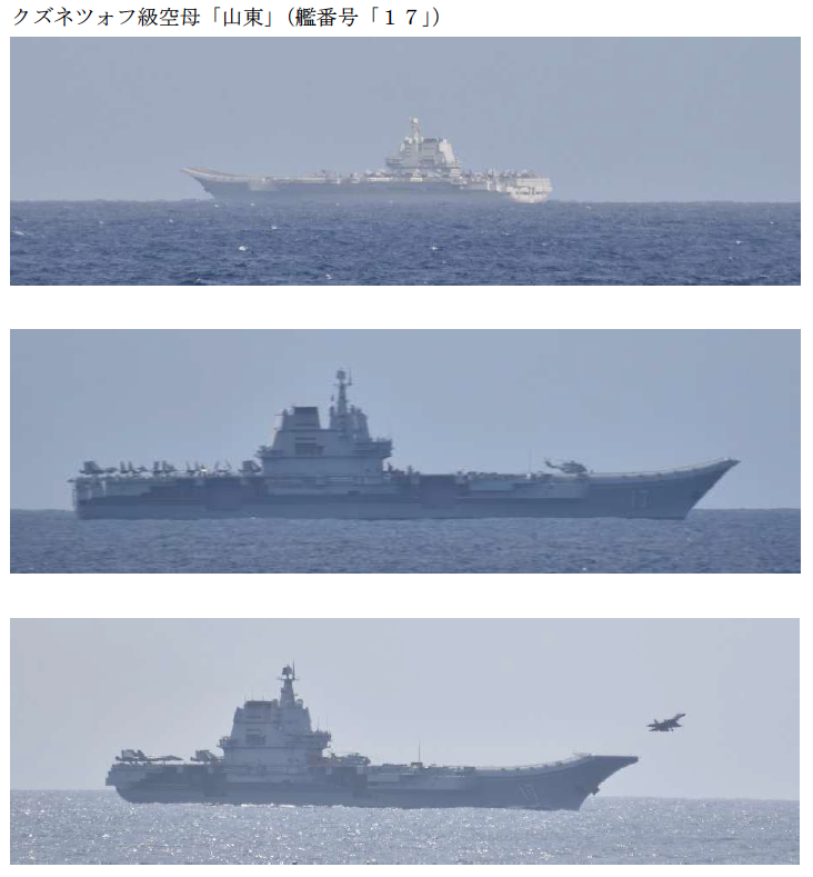 日本自衞隊照片顯示,中國航母山東艦(17)正在菲律賓海活動。