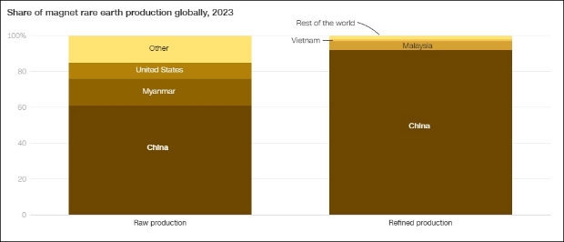 據國際能源署數據,2023年中國佔全球稀土礦產量的超60%,而加工精煉稀土化合物的產量卻佔到了全球的92%。