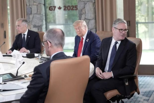 ▲6月16日,英國首相基爾·斯塔默和美國總統唐納德·特朗普出席在加拿大艾伯塔省卡納納斯基斯舉行的七國集團領導人峯會的首次工作會議。(圖源:路透社)
