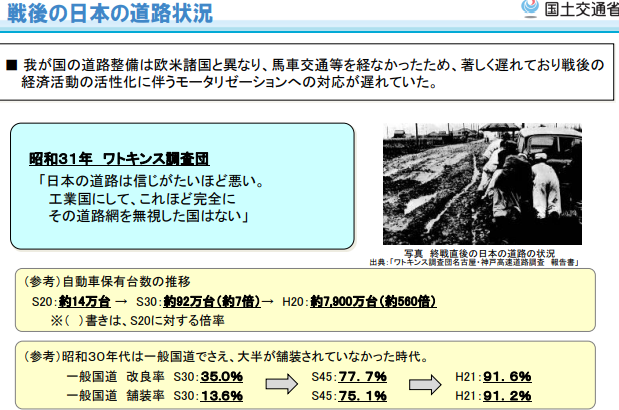 但是與汽車的快速普及不同,日本這段時間的道路鋪設極其落後,路是走不了的,當時有個廣為流傳的説法,從勝浦市運新鮮草莓去東京(120公里左右),還沒到呢,就顛成草莓醬了。