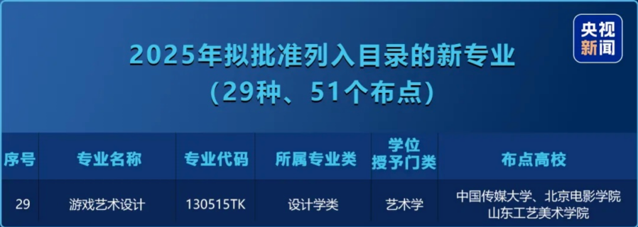 兩個月前,教育部發布最新的《普通高等學校本科專業目錄》,增列了29種新專業,其中包含“遊戲藝術設計”專業。這是遊戲專業首次被列入本科專業目錄,意味着遊戲專業教育正式得到國家的認可。
