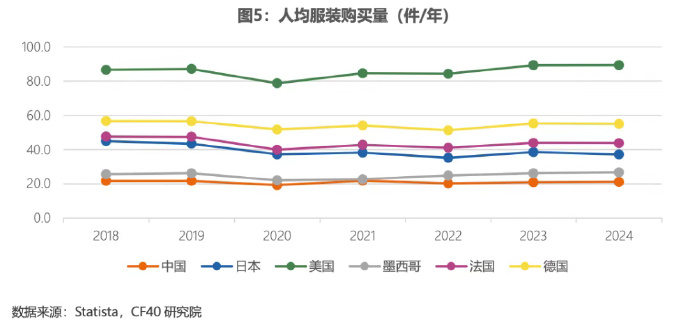 4. 但是,其它實物商品消費中國就不太行了。2024年中國人均每年購買服裝22件,與墨西哥差不多。大幅低於日本、法國、德國和美國的37件、43件、55件和90件。這還是消費意識不行,即使便宜也不買。有些消費者買衣服還經常退貨,商家苦不堪言。中國鞋子消費也不行,2022年人均買鞋2.78雙,只比墨西哥的2.45雙多點,日本、法國和德國5雙,美國8雙。