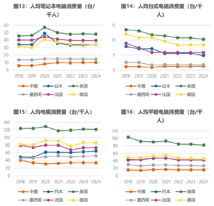 6. 電子產品。中國的電腦消費量差不少,2024年千人筆記本電腦購買量只有10台,墨西哥15台,美國48台,法國39台,日本德國34台。2024年中國千人電視購買量為34台,墨西哥52台,日本為65台,美國121台。平板電腦,中國千人16台,墨西哥27台,日本和美國是中國2倍和4倍。手機方面,我國2024年温和回升到千人192部,略低於德國、法國、日本和墨西哥,美國388部。