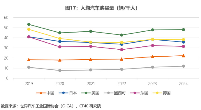 7. 汽車,2024年中國千人22輛,是墨西哥的2倍。美國、德國、日本和法國48、38、36和31輛,都大幅領先。總體來説,中國比墨西哥吃喝、空調、汽車要高些,其它差不多甚至略低。與發達國家相比,人均消費商品數量還差很多,增長潛力很大。有些項目,起碼不應該比墨西哥差。