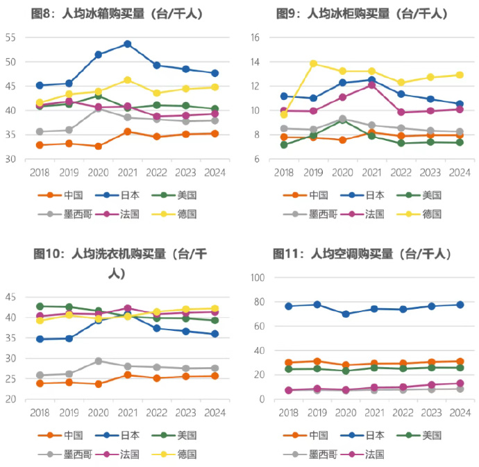 5. 家用電器,中國也有差距。千人冰箱購買量35台,低於墨西哥的38台、法國的39台和美國的40台,德國和日本45台和48台。冰櫃方面,中國、美國和墨西哥千人購買量約8台,日本與法國約11台,德國13台。洗衣機,中國千人26台,墨西哥28台,日美法德36、39、41、42台。空調,中國千人31台,日本78台,但其它國家差點,美國26台,法國13台,墨西哥8台。中國空調有優勢,可能是電力比墨西哥強。