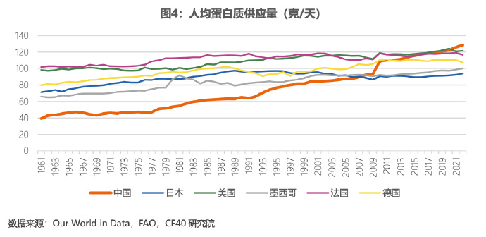 3. 2021年中國的人均蛋白質攝入量每天125.9克,超過了美國,領先墨西哥不少。金額扯不清,人均餐飲消費是美國六分之一。但是從物質角度,吃喝方面沒啥可抱怨的了。我觀察到,很窮的家庭也吃得不錯,高價水果也有時吃。不少東西在降價,如榴蓮、小龍蝦,還不用出門直接送來,越來越多吃貨宅家大吃。