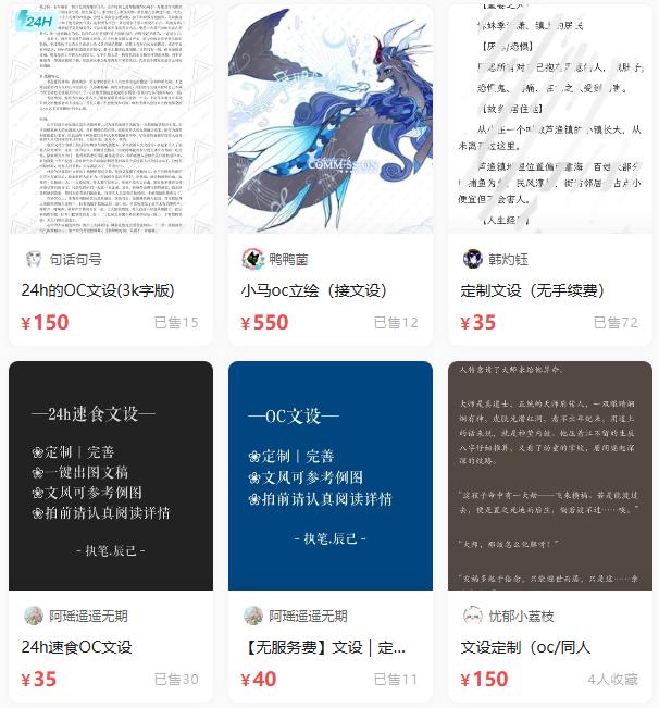 隨着圈子的發展,“設子”的形式也正日趨多元,逐漸出現了文字類型的世界觀、人物設定等“設定”出售。