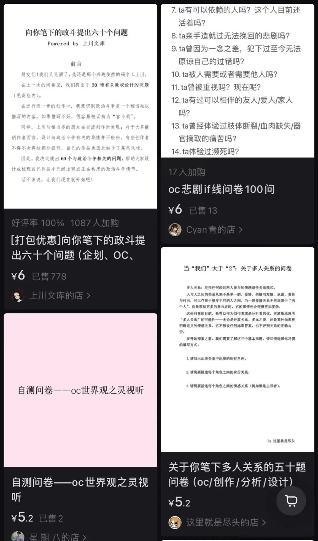 畢竟,這類深度挖掘角色內核的問卷,在過往的OC圈層中,大多是以免費共享的互助形式存在的。