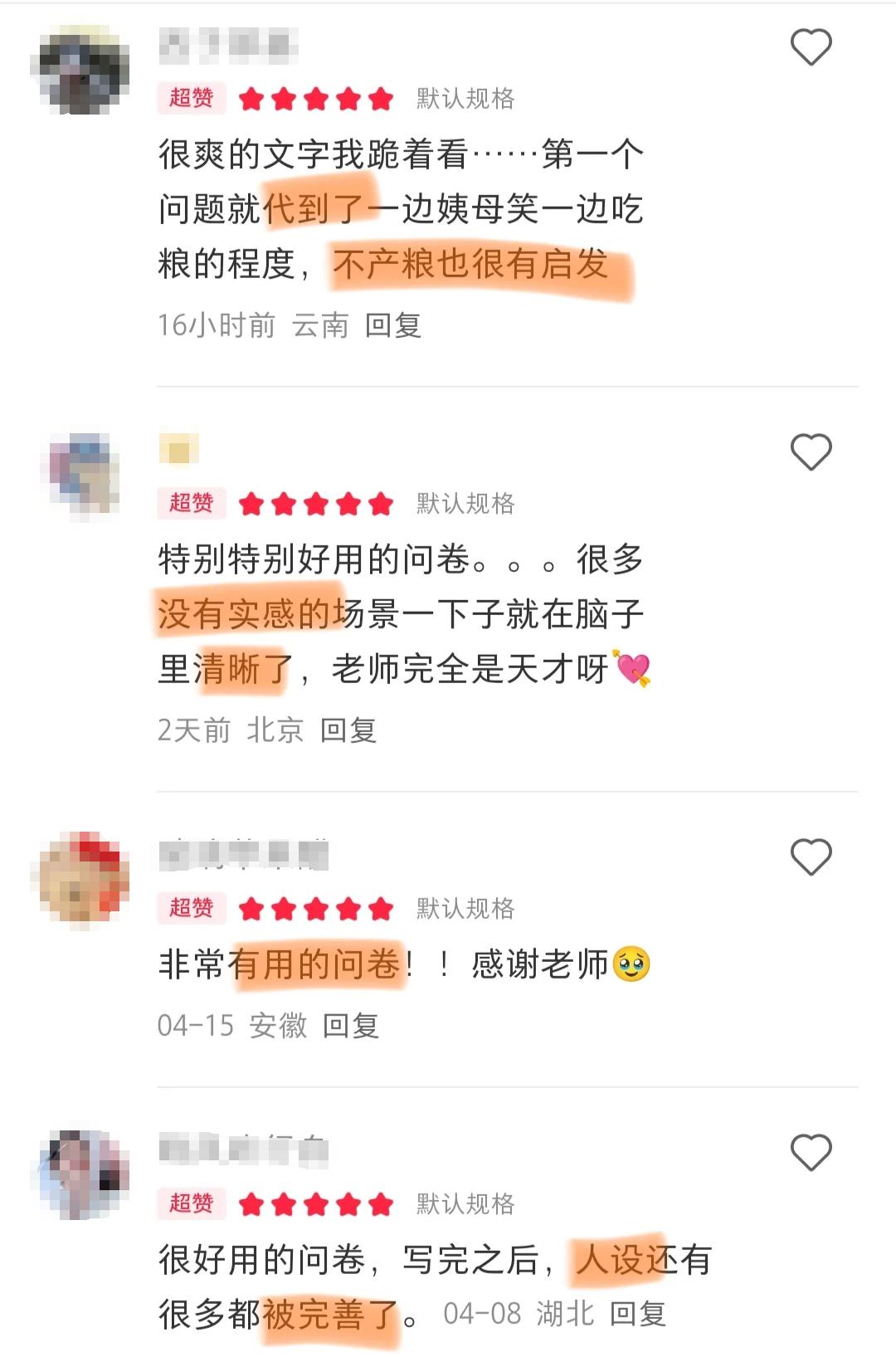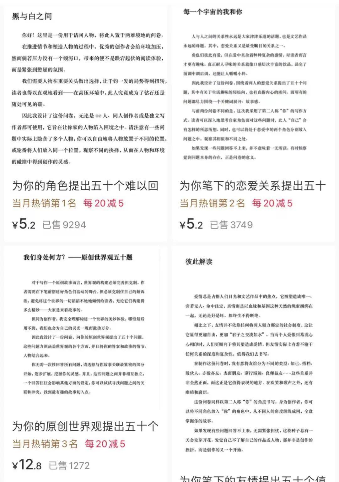 更令人驚訝的是,在她的店鋪裏,類似的問卷同樣熱銷:“為你筆下的戀愛關係提出50個需要共同回答的問題”、“為你的原創世界觀提出50個需要深思的問題”……