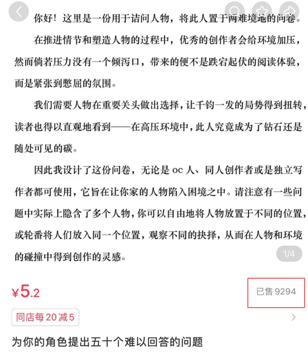 起初,我也是這麼認為的。但説來你可能不信,小紅書博主@雨上晴空製作的問卷——“為你的角色提出五十個難以回答的問題”,標價5.2元,卻在近3個月內賣出了超過9千份。