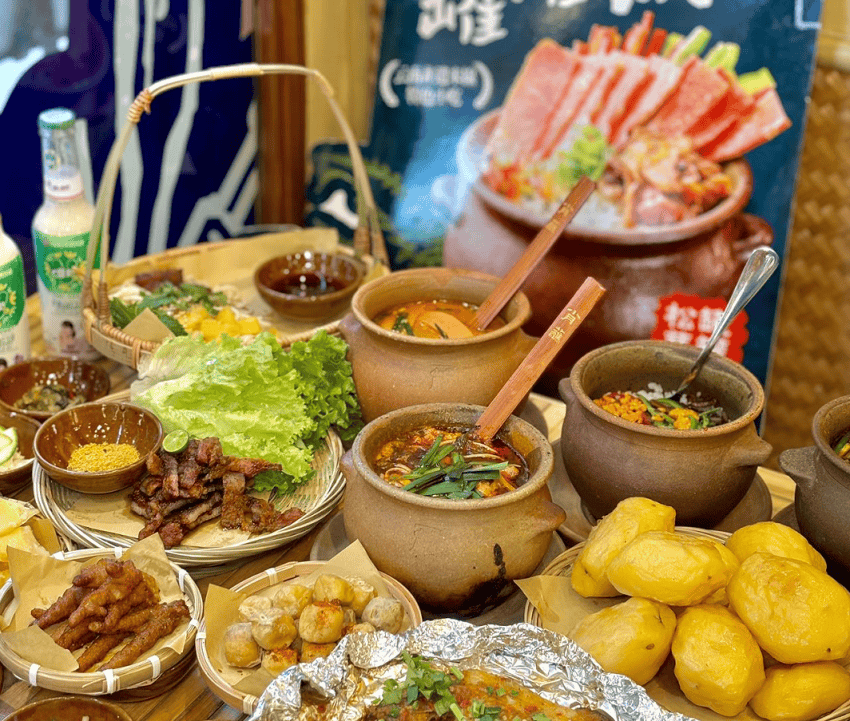 品牌巧妙借鑑蒙自過橋米線“先放生料、後燙米線”的儀式流程,結合柴燒罐的使用,設計獨特的上菜儀式。服務員端上滾燙的柴燒罐高湯與擺放整齊的生配菜、蒙自米線,現場講解並指導顧客按照順序將食材逐一放入罐中,體驗親手“製作”美食的樂趣,增強用餐的互動性與記憶點。