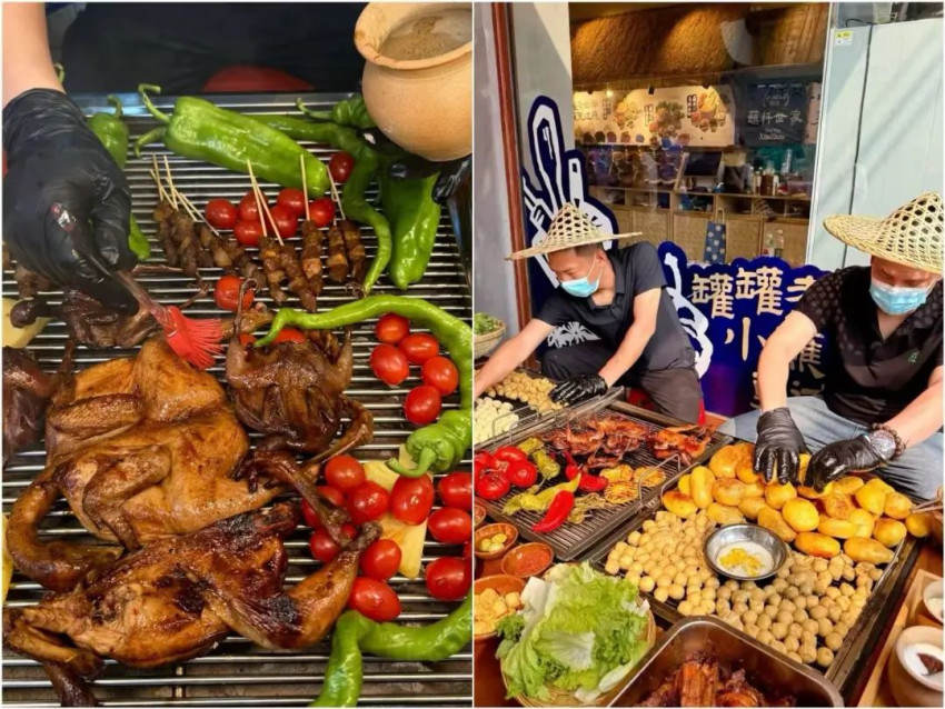 值得一提的是,門店還推出了燒烤品類,並創新採用明檔現烤設計,將煙火氣十足的燒烤場景搬到店門口。明豔豔的炭火上,包漿豆腐滋滋冒油、箇舊小肉串金黃焦脆,路過的客人便能聞到滋味,成為天然引流招牌。