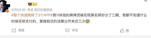 「我11塊錢的麻辣燙被花唄莫名其妙分了三期,我都不知道什麼時候花唄支付的,要提前還的話要分開來還三次」