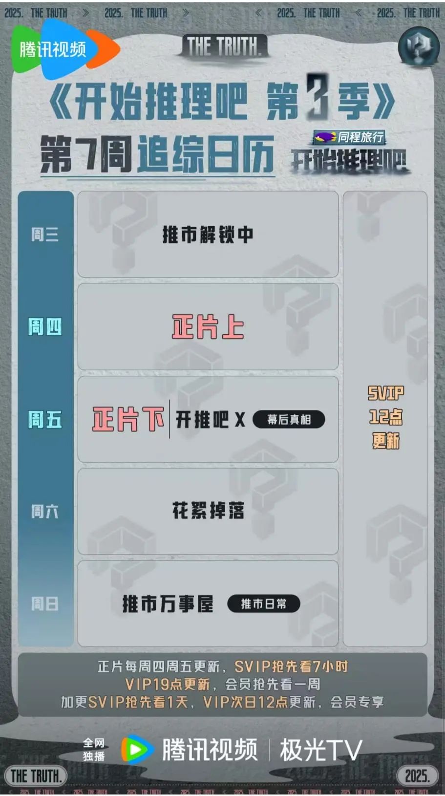 《開始推理吧》用三年時間完成了一場精準的羣像資產積累。“赫麗模金宇”6人從陌生到默契的進化過程,賦予節目獨特的“陪伴感”與破圈共情力。疊加張凌赫、劉宇寧等爆款劇演員的流量加持,“開推”IP影響力持續擴張。