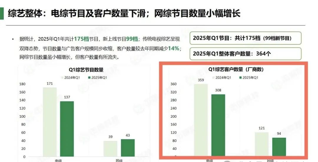 根據擊壤《2025年Q1綜藝植入簡報》中的數據顯示,2025年Q1電視綜藝客户數量與去年同期相比下降了14.2%,網綜客户數則下降22.3%。