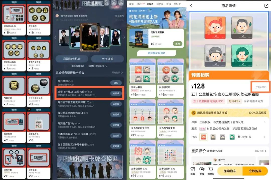 其次,在衍生品開發方面,節目有家族禮包、冰箱貼、鑰匙扣等周邊。同時,通過完成任務還能獲得抽小卡的機會。在任務中有一項為“觀看《開推3》正片10分鐘”,對於視頻平台來説,通常觀看10分鐘及以上正片的用户會計入會員收入。這個抽小卡機制,既拉高站內互動熱度,更將粉絲行為直接轉化為會員收入。這套組合拳在迪麗熱巴、張凌赫、劉宇寧等流量加持下效果顯著。《五十公里桃花塢》《現在就出發》《地球超新鮮》等IP正快速複製此路徑,構建騰訊的“羣像創收矩陣”。