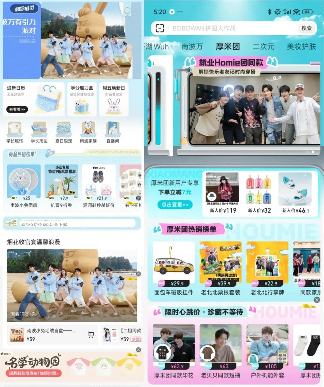 芒果TV的養成宇宙更為豐富,其中最成功的當屬“院人”以及分化出來的“南波萬男團”。從《名偵探學院》開始培養的院人羣像,後來又通過《跳進地理書的旅行》《森林進化論》《南波萬的聚會》等定製化綜藝實力圈粉,收穫了一大批忠實的“學分”。除此之外,“0713男團”也在芒果土壤中生根發芽,擁有大批固定受眾。而依託小芒電商生態,“南波萬”和“厚米團”都有相關衍生周邊、同款服飾售賣,在2023年南波萬的GMV就超過了2.7億元。