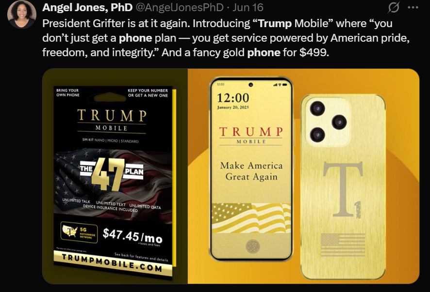 嘴炮總統又來圈錢了,他推出了“川普移動”服務,聲稱“你得到的不僅僅是一部售價 499 美元的高檔金色手機和一份手機套餐,而是以美國式自豪、自由和正直為核心的服務。