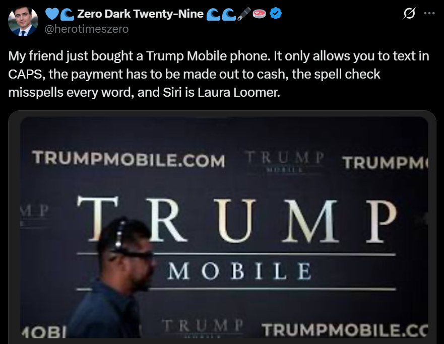 我朋友剛買了一部川普手機。它只能用大寫字母發短信,付款必須現金,拼寫檢查每個單詞都拼錯,而且Siri是Laura Loomer。