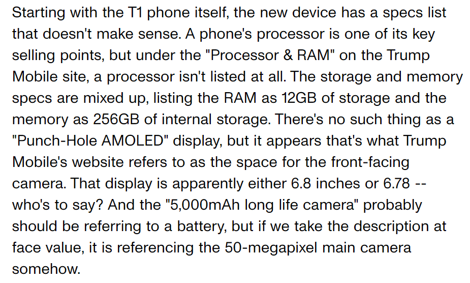 來,咱捋一遍Trump Mobile官網上T1手機的“配置”頁面(也可以叫“考驗閲讀理解大賽”):