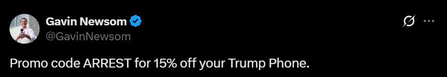 加州州長紐森也下場玩梗,使用折扣碼【逮捕】購買川普手機,享受85折優惠。