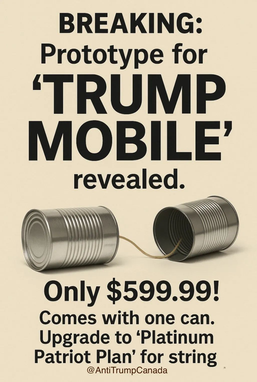 來來來,走過路過別錯過,川普手機只要599.99,到手後你能看到一個空瓶罐頭,升級到“白金愛國者套餐”,贈送細繩一條