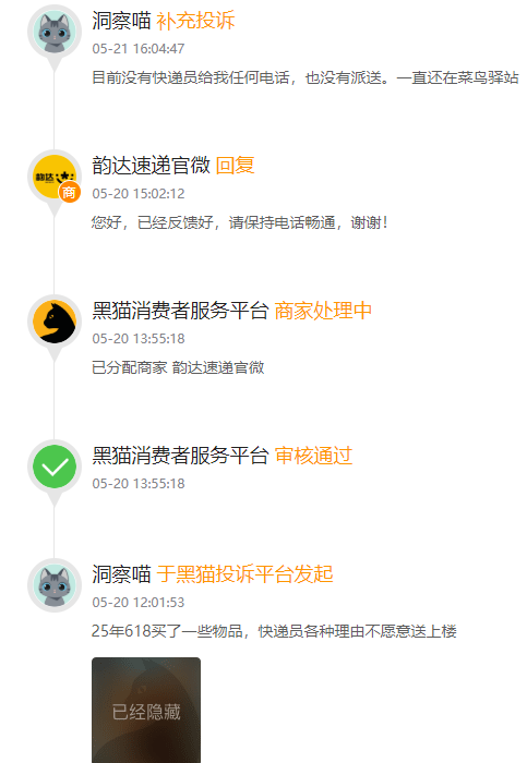 2025年5月21日,有網友在黑貓投訴平台稱,韻達無人派件,不管是本地的韻達電話還是韻達客服電話95546,都無人處理,最後只能在平台投訴。