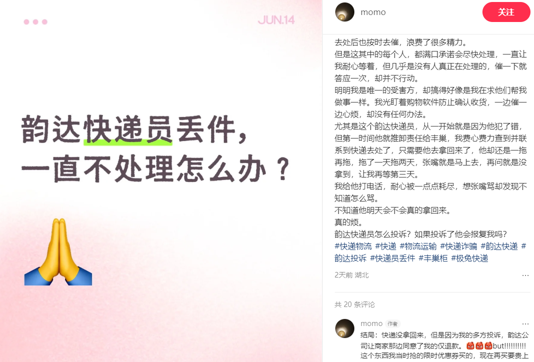 小紅書上有網友表示,網購的物品由韻達快遞運送,物流顯示投入豐巢櫃,掃碼取件時發現是空櫃,該網友經過與快遞員、豐巢官方、網購平台聯繫後,確認是韻達快遞員放錯了格子,被其他公司的快遞員拿走了,當網友與派送的快遞員聯繫幫助取回時,雖口頭答應,卻一直沒有取回。