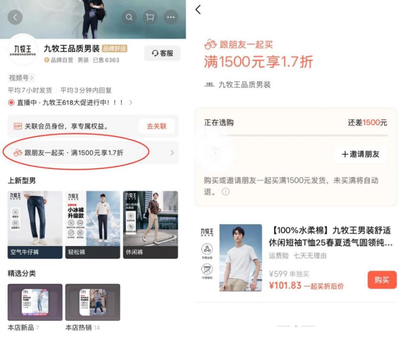 近日,九牧王作為第一批參與“一起買”內測的企業,其分享了這一新功能。用户進入微信小店後,在首頁即可看到“跟朋友一起買”的提示。進入拼單頁面後,用户可以直接選擇任一商品進行下單,也可以將拼團鏈接分享給微信好友或社羣。