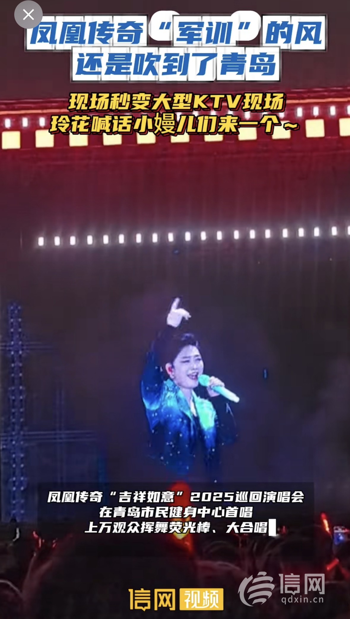 演出現場(來源:鳳凰傳奇工作室)信網6月17日訊 6月13日-6月15日,“軍訓”的風吹到了青島!鳳凰傳奇“吉祥如意”巡迴演唱會在青島連嗨三天!萬人齊唱,氣氛熱烈,熒光棒組成的星海點燃全場激情。