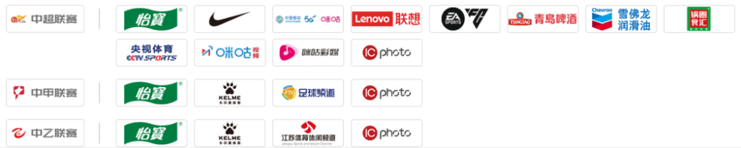 另一邊,根據中國足球職業聯賽聯合會官網數據顯示,中超聯賽的冠名贊助商為怡寶;官方戰略合作伙伴包括耐克、中國移動咪咕;官方合作伙伴包括聯想、EAFC、青島啤酒;官方贊助商為雪佛龍潤滑油、鍋圈食匯;官方全媒體合作伙伴央視體育、咪咕視頻、咪咕彩媒;以及官方圖片合作機構IC photo,一共12家。