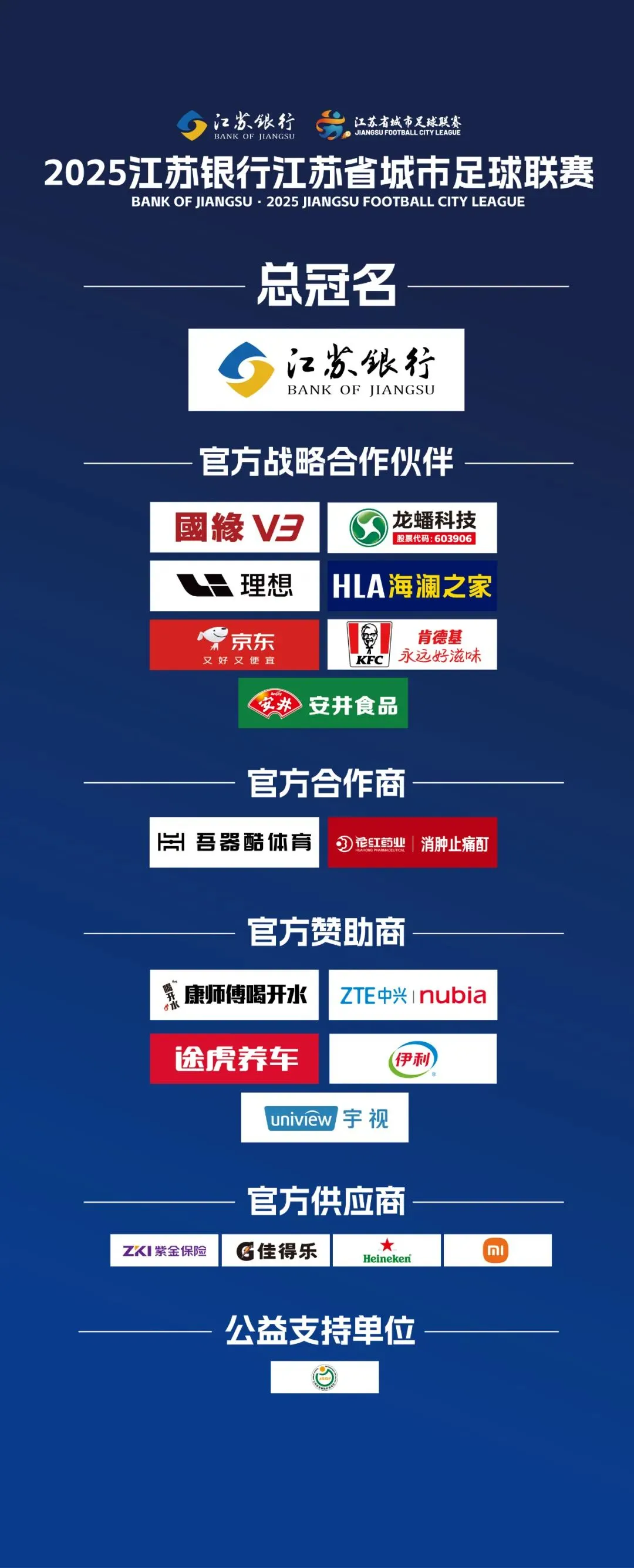 6月13日當晚,微信公眾號“江蘇省城市足球聯賽”發佈了“蘇超第四輪轉播計劃表”的相關內容,並附上了最新的贊助情況。其中,賽事總冠名保持不變,依舊為江蘇銀行;官方戰略合作伙伴增加至7家企業,包括今世緣“國源V3”、龍蟠科技、理想、海瀾之家、京東、肯德基、安井食品;官方合作商發生變化,卡爾美體育消失,新增了吾器酷體育、花紅藥業“消腫止痛酊”2家;官方贊助商新增至5家,包括有康師傅“喝開水”、ZTE中興nubia、途虎養車、伊利以及uniview宇視;官方供應商新增至4家,包括有紫金保險、佳得樂、Heineken喜力、小米,贊助商數量(除去公益支持單位)達到19家。