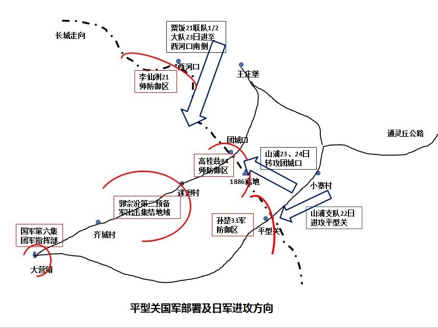閻錫山第二戰區以第6集團軍防守平型關。國軍在平型關由北向南一線展開的部署是:李先洲第21師、高桂滋第84師(位於團城口)、孫楚第33軍(位於平型關)。增援的郭宗汾第2軍位於平型關內的迷回村地區作為出擊預備隊。第6集團軍指揮部位於大營鎮(見圖2)。