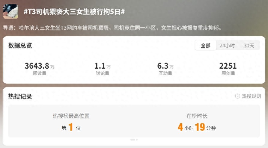6月18日,話題“T3司機猥褻大三女生被行拘5日”的內容閲讀量突破3600萬,在登頂微博熱搜榜的同時引發了各界網友熱議。