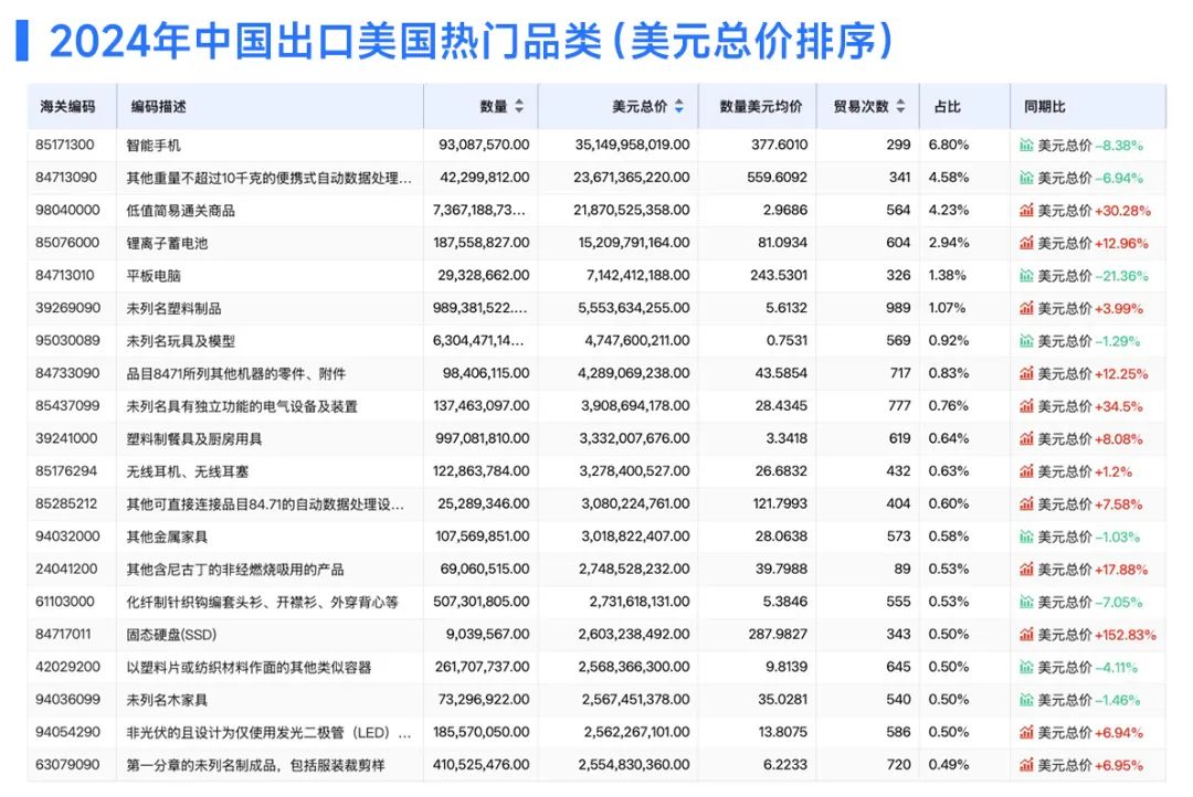2024年中國出口美國熱門品類主要是機電產品、雜項製品、紡織原料及製品、塑料製品、傢俱及寢具、玩具、汽車及零部件、手機及相關設備、鋼材、農產品等。
