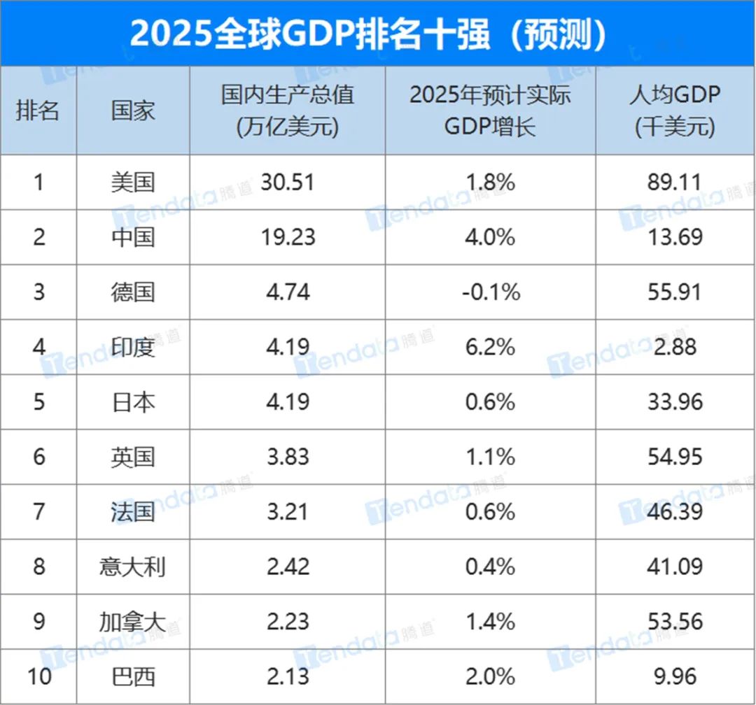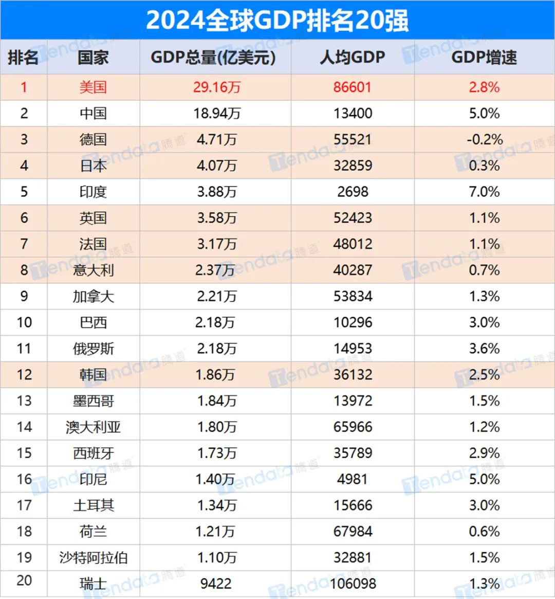 2024年全球GDP排名前十的國家中,美國以28.78萬億美元的GDP位居榜首,中國緊隨其後,GDP總量達到18.94萬億美元。