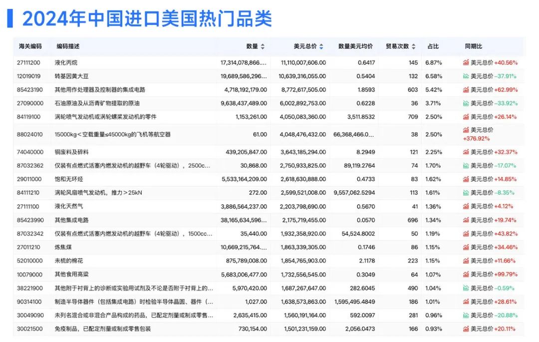 2024年中國進口美國的熱門涵蓋高端半導體、機械、民用飛機、高端集成電路、芯片、能源、農產品(大豆為主)及化工材料等。