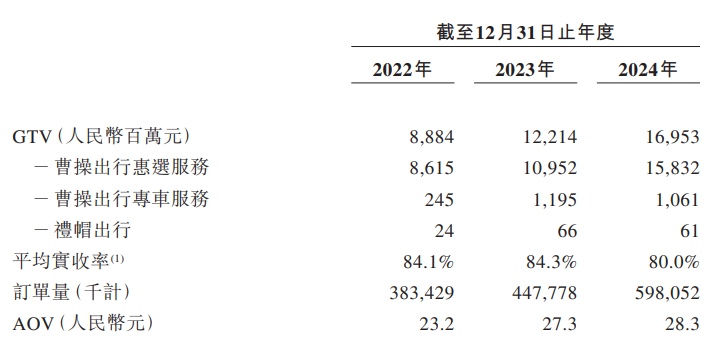 具體到業務構成。出行服務連續三年貢獻了超過90%的收入,GTV(總交易額)、訂單量、AOV(平均訂單價)等多項關鍵指標持續增長:2022~2024年,曹操出行的GTV分別為88.84億元、122.14億元、169.53億元,訂單量分別為3.83億單、4.48億單、5.98億單,AOV分別為23.2元、27.3元和28.3元。