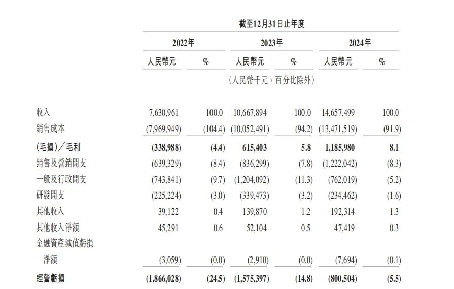 從2022年至2024年,曹操出行的營收分別為76.31億元、106.68億元、146.57億元,毛利分別為-3.39億元、6.15億元、11.86億元,毛利率分別為-4.4%、5.8%、8.1%,經調整淨虧為16.51億元、9.66億元、7.24億元。