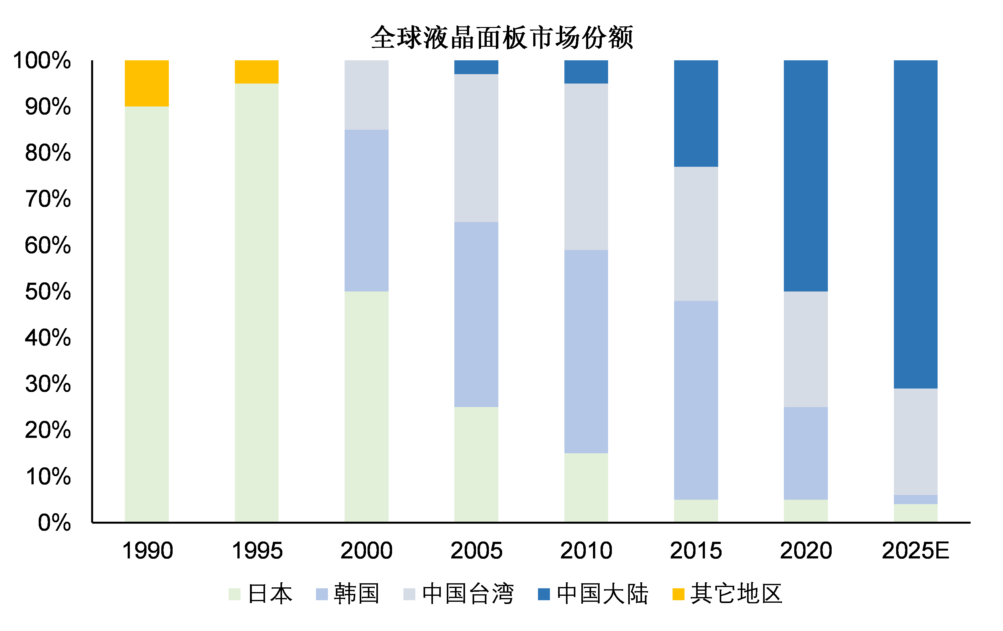 2020年後中國企業在全球液晶面板的市場份額超過50%,到2025年連韓國企業都徹底退出了液晶面板市場。