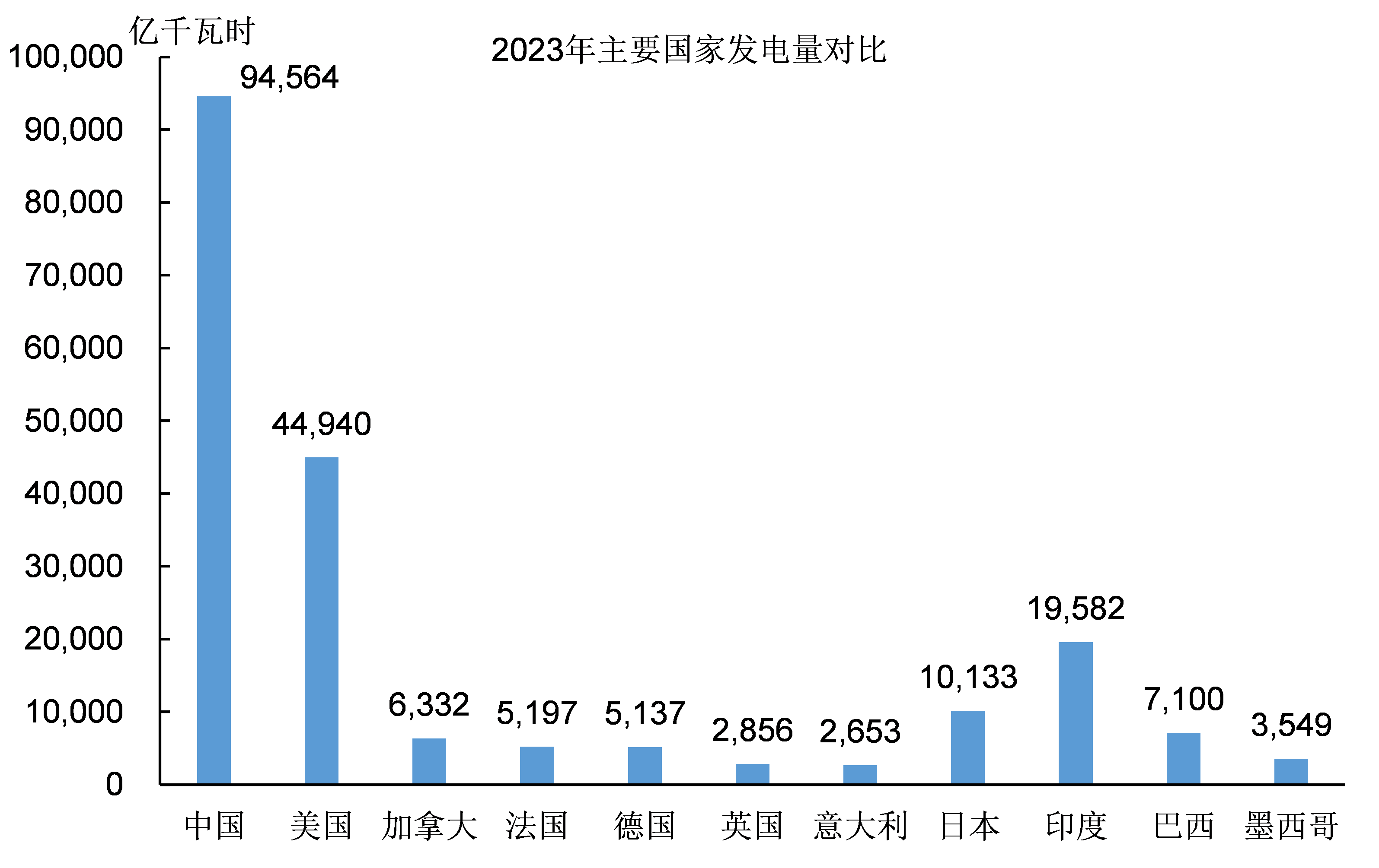 2023年日本發電量同樣位居全球第四,全球各國的發電量呈階梯式分佈: