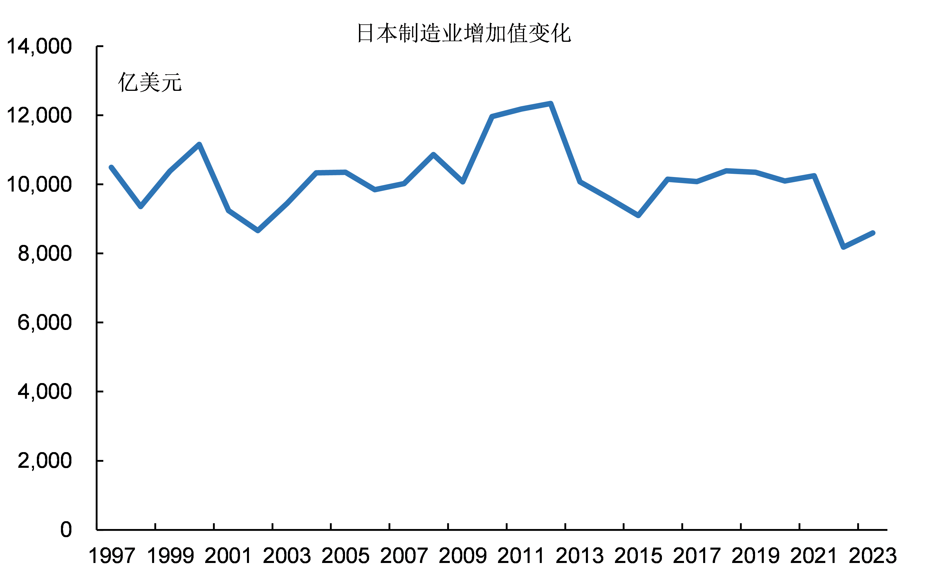 日本製造業增加值在1997年就已經達到10490億美元,此後維持在9000~12000億美元附近波動,一直持續到2021年。