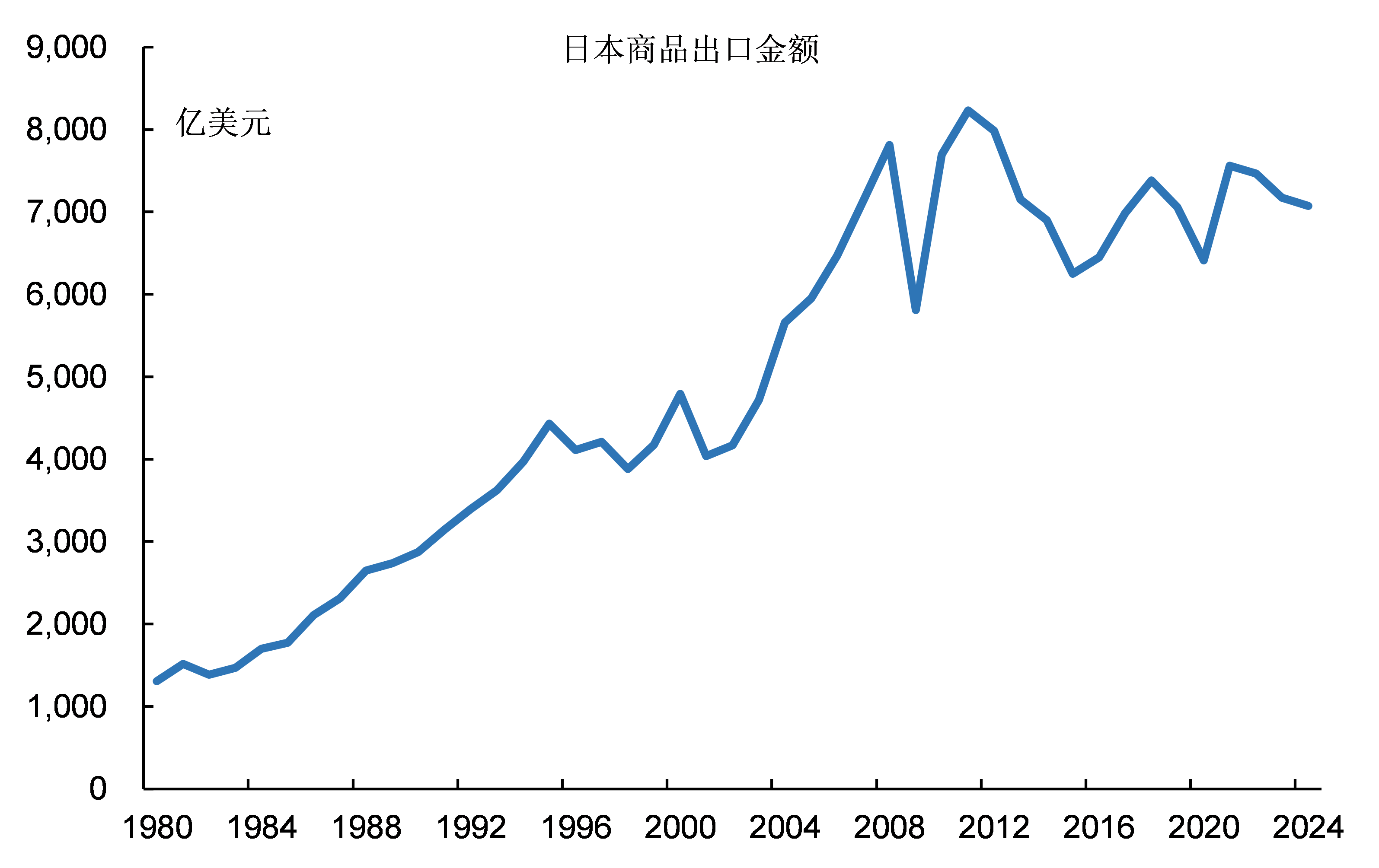 日本商品出口金額在2006年首次超過6000億美元,此後一直到2024年基本維持在6000~8000億美元之間波動。