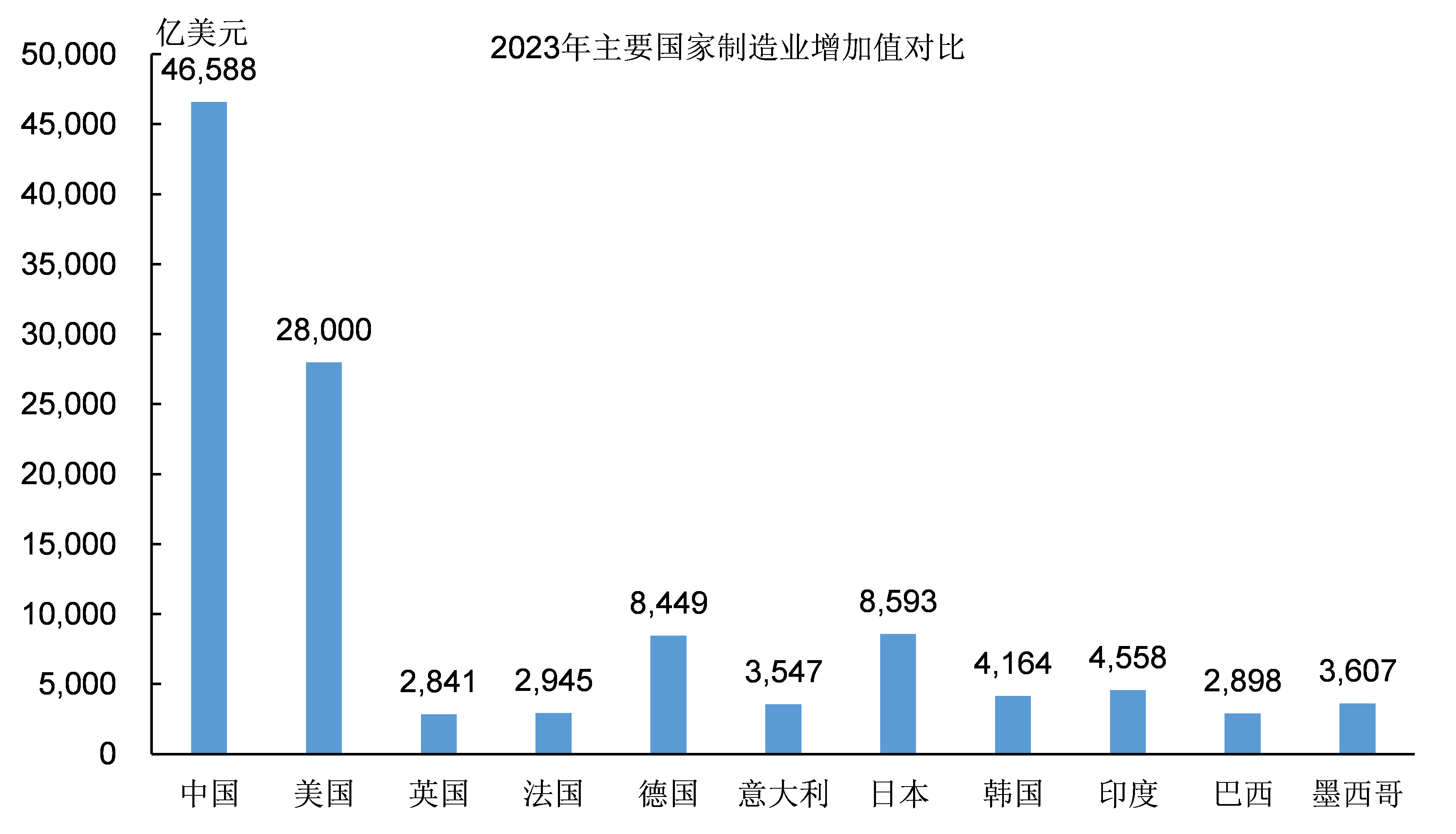 中國製造業規模增長的速度最快:2000年中國製造業的增加值只有3690億美元,2023年則增長至4.7萬億美元,擴大了十幾倍。