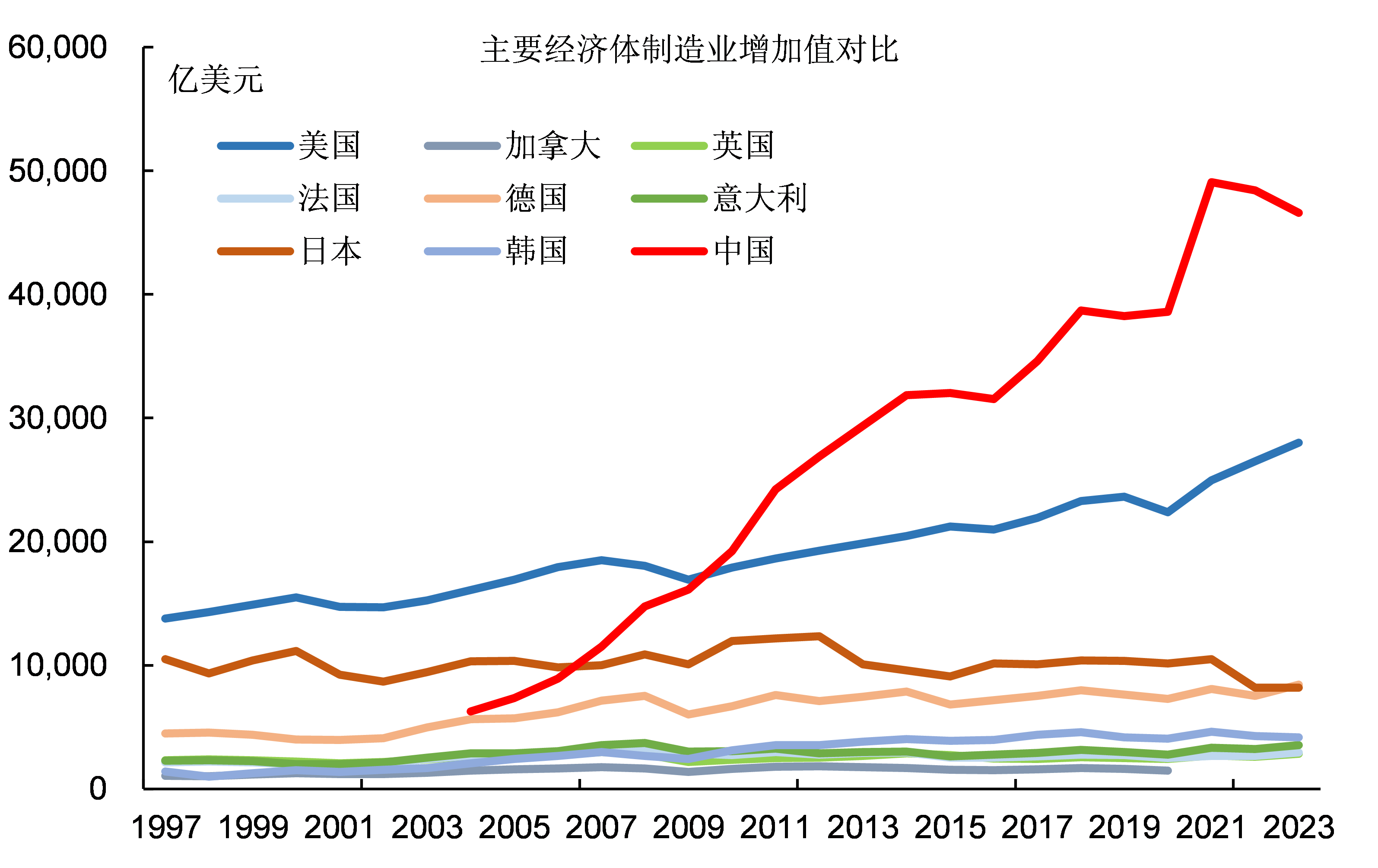 從1997年到2023年,美國和德國的製造業規模幾乎都擴大了一倍:美國製造業增加值增長了近1.5萬億美元,德國製造業增加值增長了4000億美元。