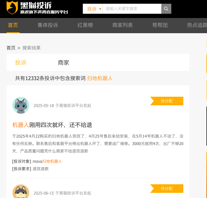 黑貓投訴中,包含“掃地機器人”的搜索詞的相關投訴高達12332條。