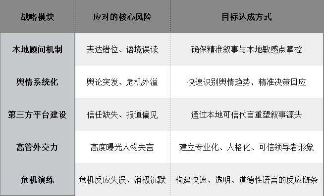 ****1. 建立“本地顧問 + 國際總部”的協調傳播機制********戰略內核:****本地團隊提供語境敏感性和關係網絡,總部輸出資源和一致性敍事,形成“全球一致、本地優化”的傳播結構。