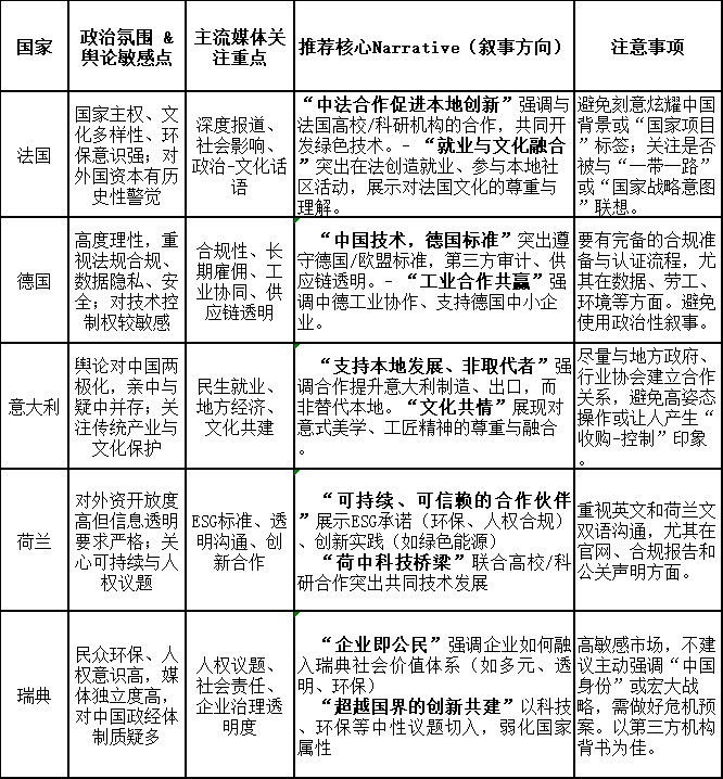 **·******統一主幹(****Pan-European Narrative):****如“我們是歐洲綠色轉型的合作伙伴”、“我們遵守歐盟法律與價值觀”、“我們在本地投資、創造就業與知識共享”。這類信息可用於歐盟機構、泛歐洲媒體、關鍵監管溝通。