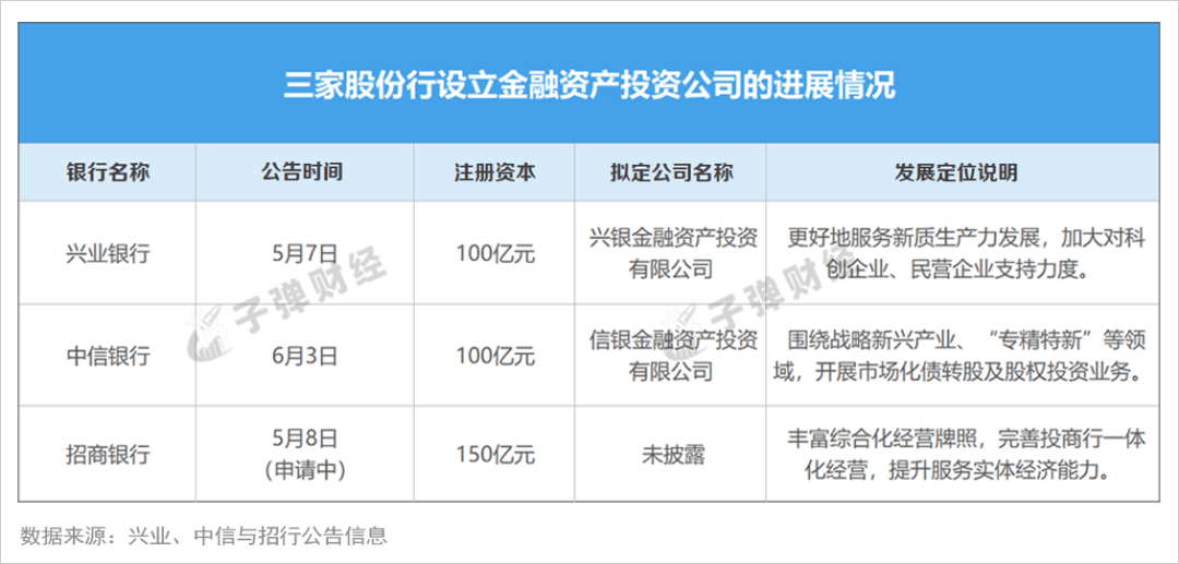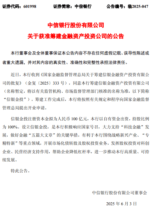 6月初,中信銀行發佈公告稱,已收到金融監管總局批覆,同意籌建信銀金融資產投資有限公司(公告披露名稱暫定,簡稱“信銀金投”),註冊資本金擬為人民幣100億元。